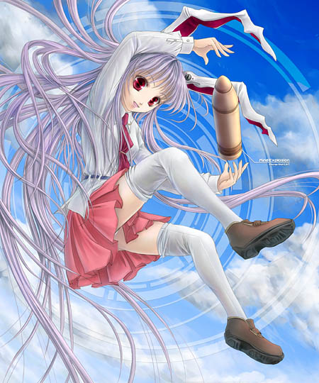 1girlanimal earsbulletclouddayfemale focusfull bodylegslong hairnecktieoutdoorspurple hairrabbit earsred eyesskysolospread legsthighhighs