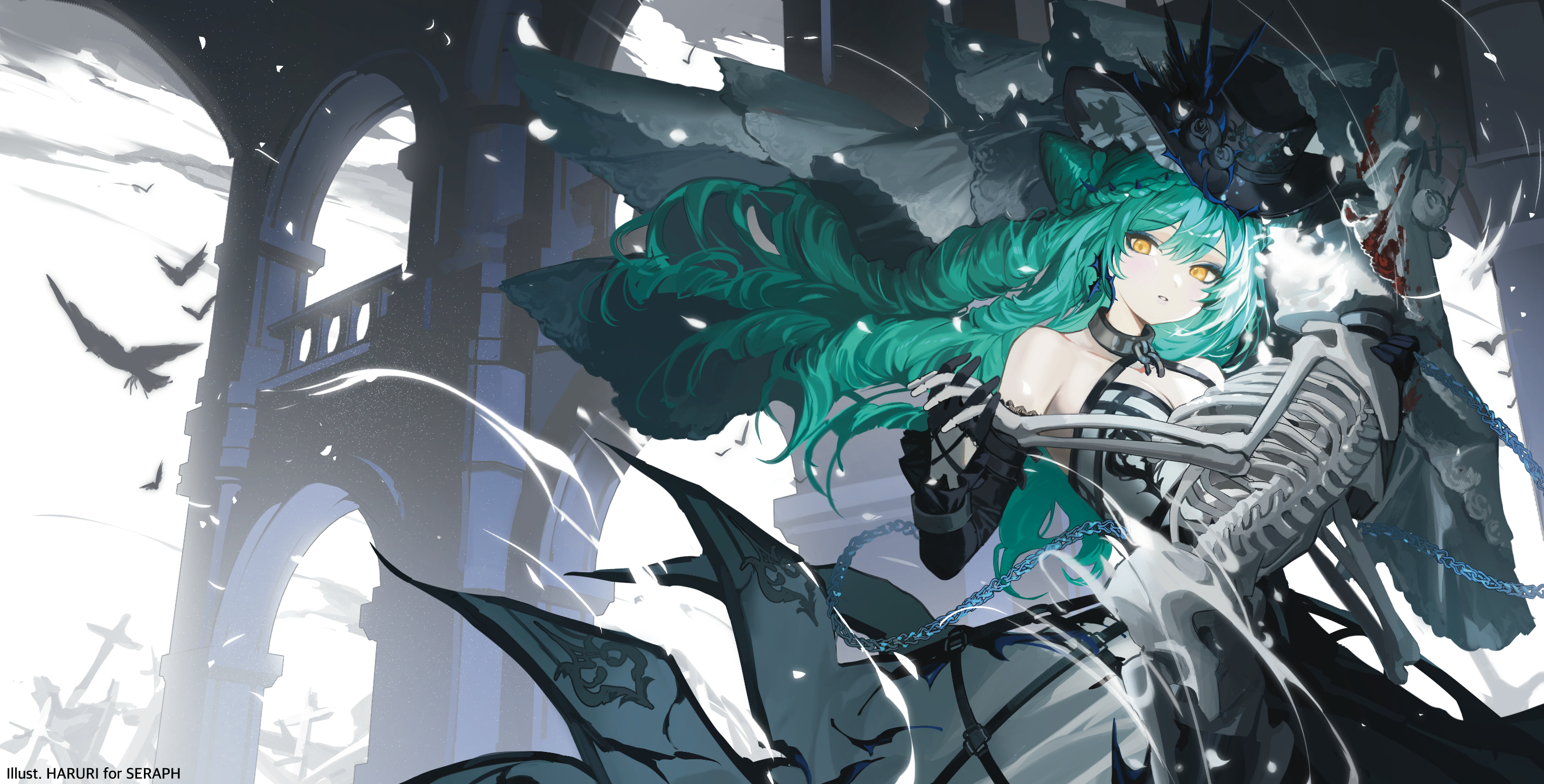 1girlanimalbare shouldersbirdblack flowerblack glovesblack hatblack roseblack sleevesbraidbreastscleavagecone hair buncrossdetached sleevesdressfloating hairflowerglovesgreen hairgrey dresshair between eyeshair bunhathat flowerlatin crosslong hairlong sleeveslooking at viewermedium breastsroseskeletonsolovery long hairwhite backgroundyellow eyes