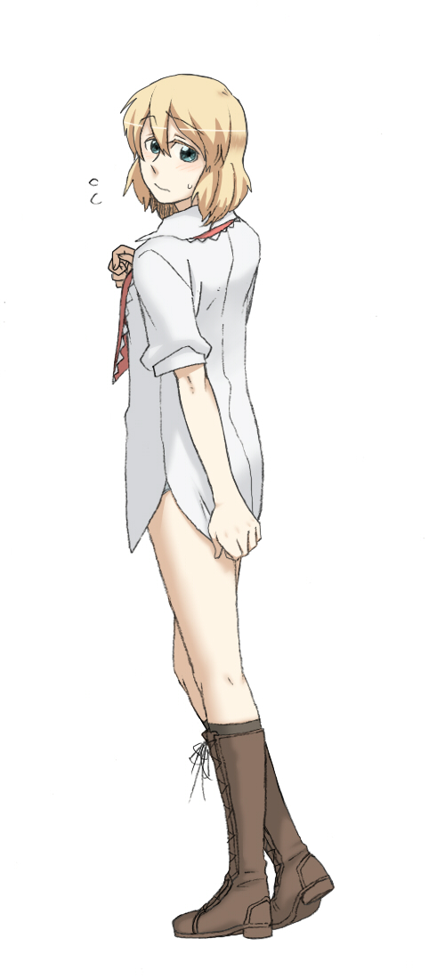 1girlblonde hairblue eyesbootsdress shirtfemale focusfull bodyno pantsshirtshort hairsimple backgroundsolostandingwhite background