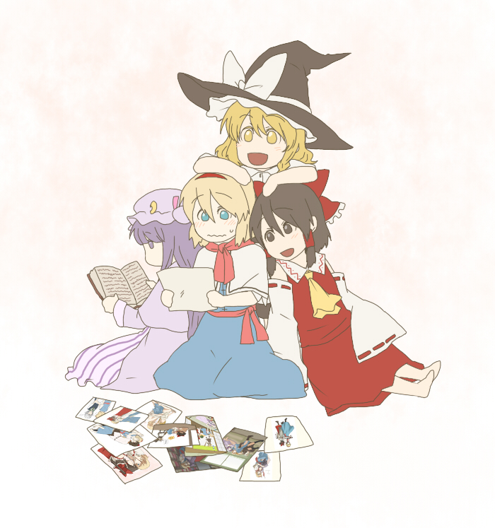 4girlsbarefootblonde hairblue eyesbookbrown eyesbrown hairdetached sleevesdressfemale focusflat colorgradient backgroundhairbandhatjapanese clotheslong hairmikomultiple girlsphoto (object)purple eyespurple hairskirtwhite backgroundwitchwitch hatyellow eyes