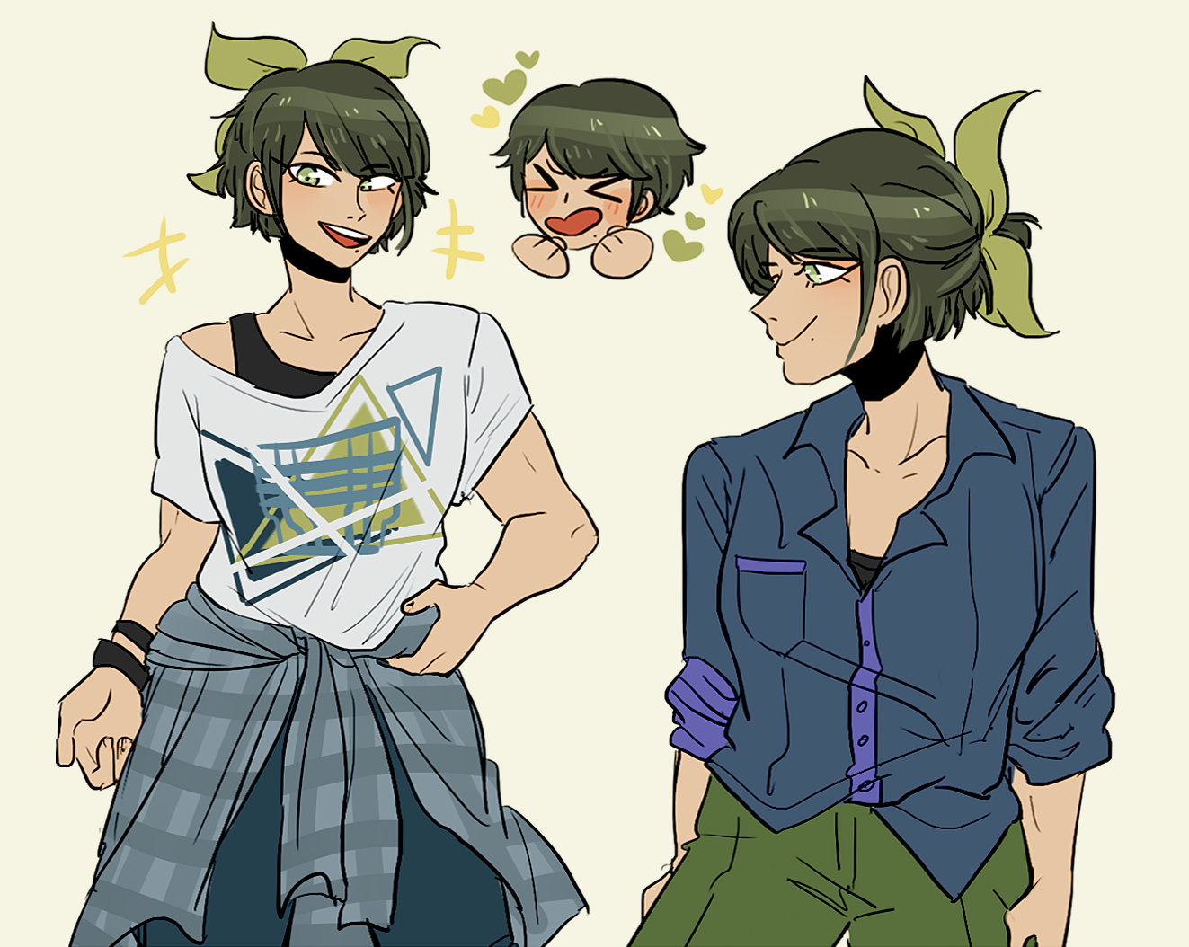 1boy1girlalternate costumealternate hair lengthalternate hairstyleblue pantsblue shirtblushblush stickersbraceletclosed eyesclosed mouthclothes around waistcollarbonecollared shirteyelashesgreen eyesgreen hairgreen pantsgreen ribbonhair ribbonheartjewelrymolemole under mouthmultiple viewsopen mouthpantsribbonshirtshort hairshort sleevessimple backgroundsmileteethupper teeth onlyvery short hairwhite backgroundwhite shirt