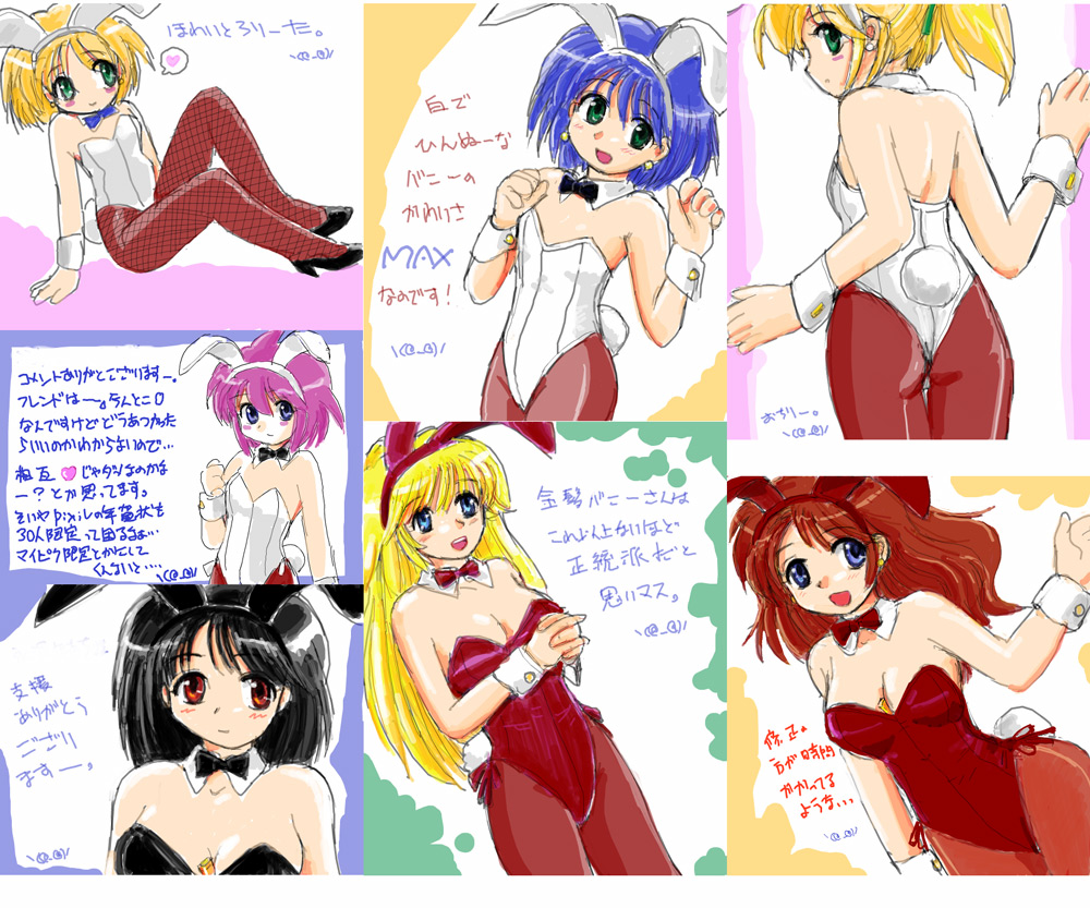 6+girlsanimal earsassblack hairblonde hairblue hairbrown hairdrawrfake animal earsfishnet pantyhosefishnetsgreen eyeslong hairmultiple girlsoekakipantyhosepink hairplayboy bunnyponytailrabbit earsred eyesshort hairtext focus