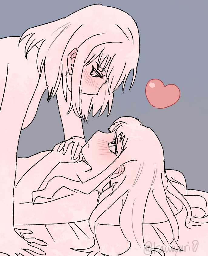 2girlsblushclosed moutheye contactheartlong hairlooking at anothermedium hairmultiple girlsnudepillowyuri