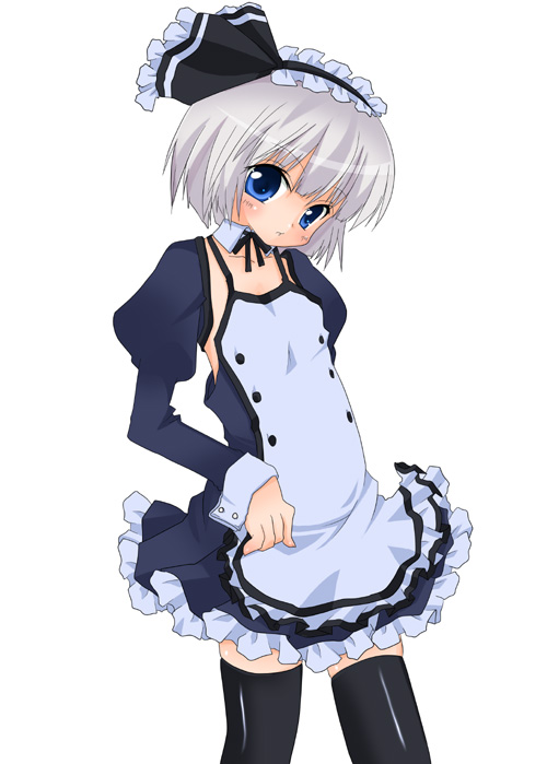 1girlblue eyesfemale focushairbandmaidshort hairsimple backgroundsolothighhighswhite backgroundzettai ryouiki