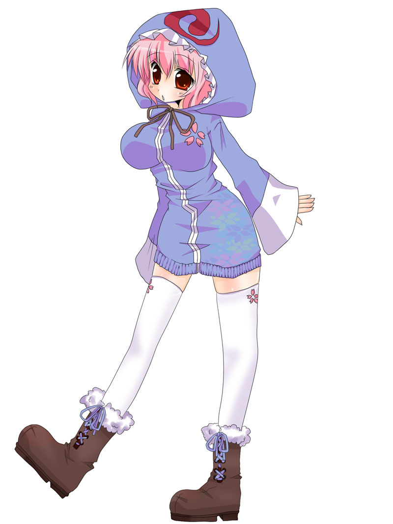 1girlbootsbreastsfemale focusfull bodyhoodhooded jacketjacketpink hairsimple backgroundsolothighhighswhite backgroundzettai ryouiki