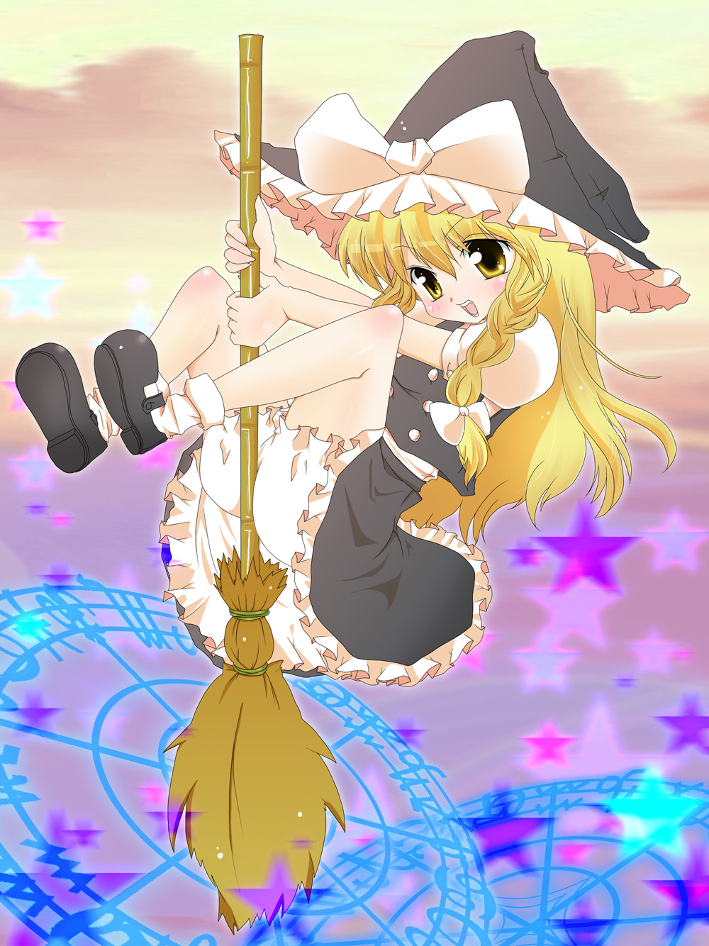 1girlblonde hairbloomersbraidbroombroom ridingfemale focusfull bodygradient backgroundhatmagic circleoutdoorsribbonskirtskysolostar (symbol)underwearwhite bloomerswitchwitch hatyellow eyes