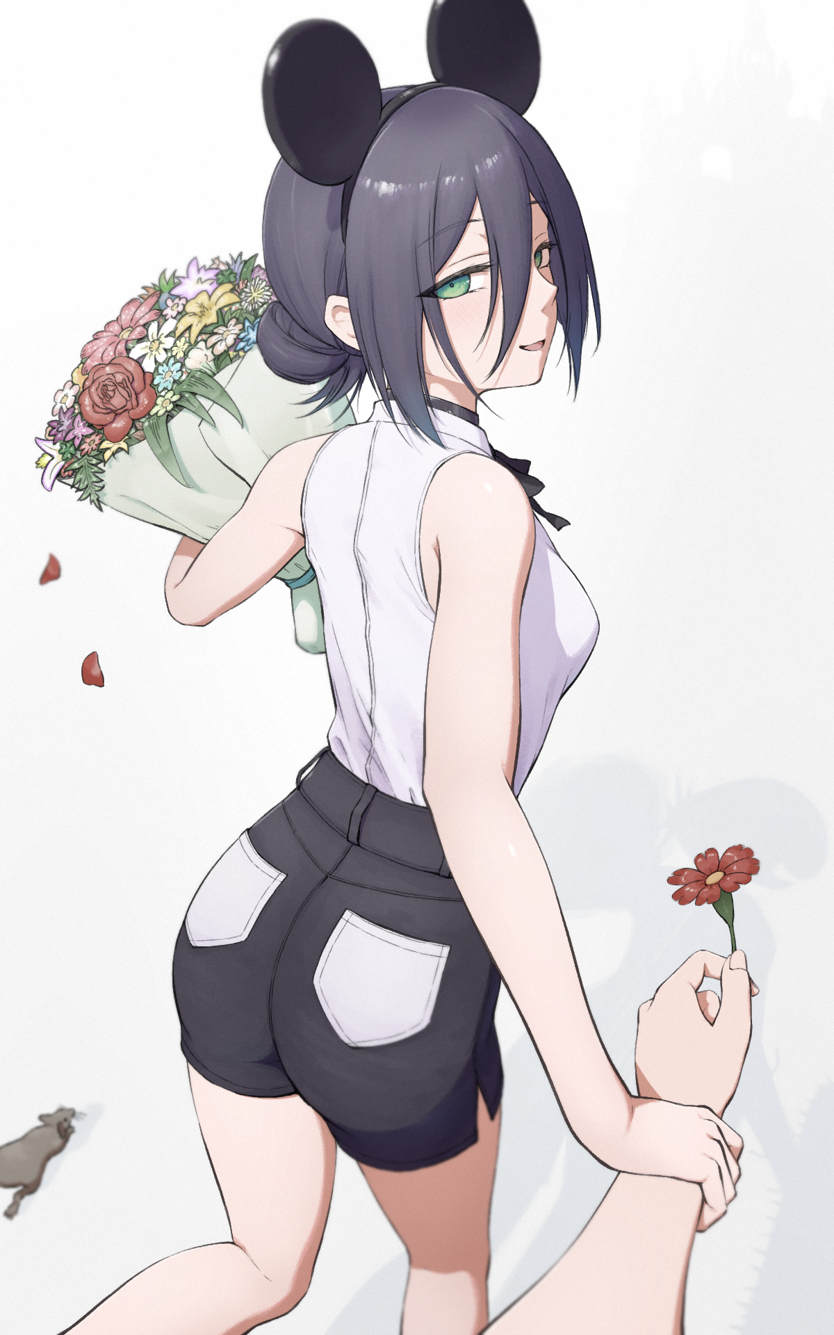 1boy1girlanimal earsassblack chokerblack hairblack shortsbouquetchokerdifferent shadowfake animal earsflowergrabbing another's armgreen eyeshair between eyeshair bunholdingholding bouquetholding flowermouse (animal)mouse earsred flowershirtshortssleevelesssleeveless shirtwhite shirt