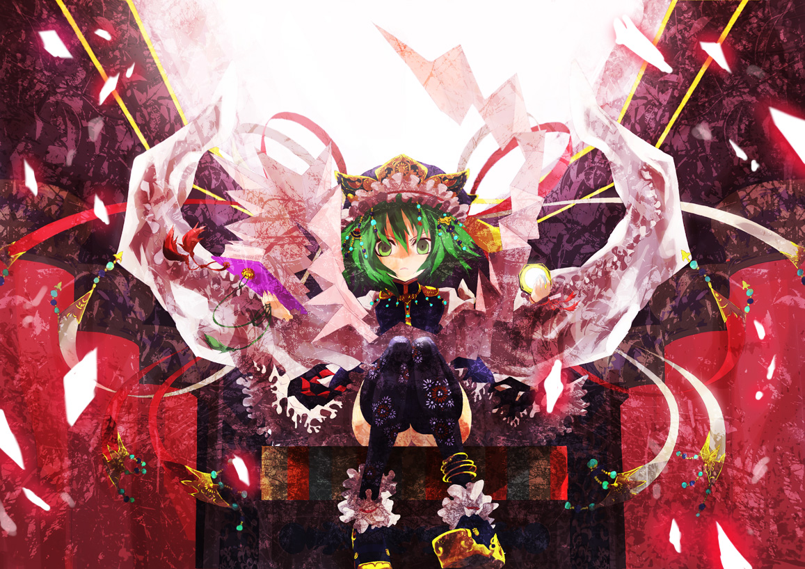 1girlalternate eye colorankletblack thighhighsfemale focusfrownglaringgreen eyesgreen hairhatjewelrymatching hair/eyesshort hairsittingsolothighhighswide sleeves