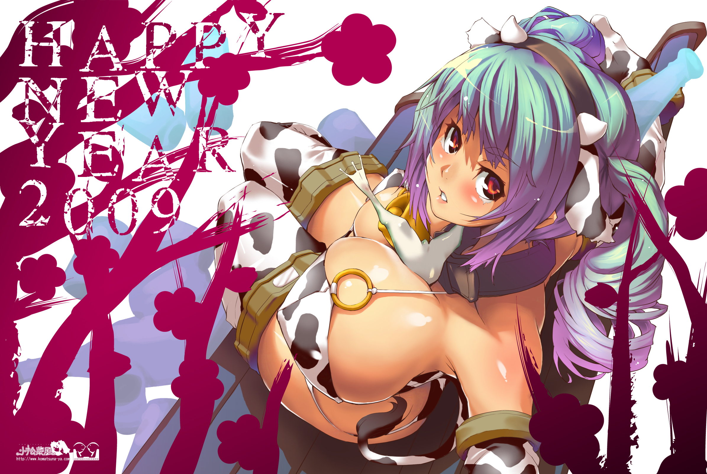 1girlanimal earsanimal printbikiniblue hairbreastscow earscow girlcow printcow tailfemale focushornslarge breastsred eyessoloswimsuittailthighhighstwintails