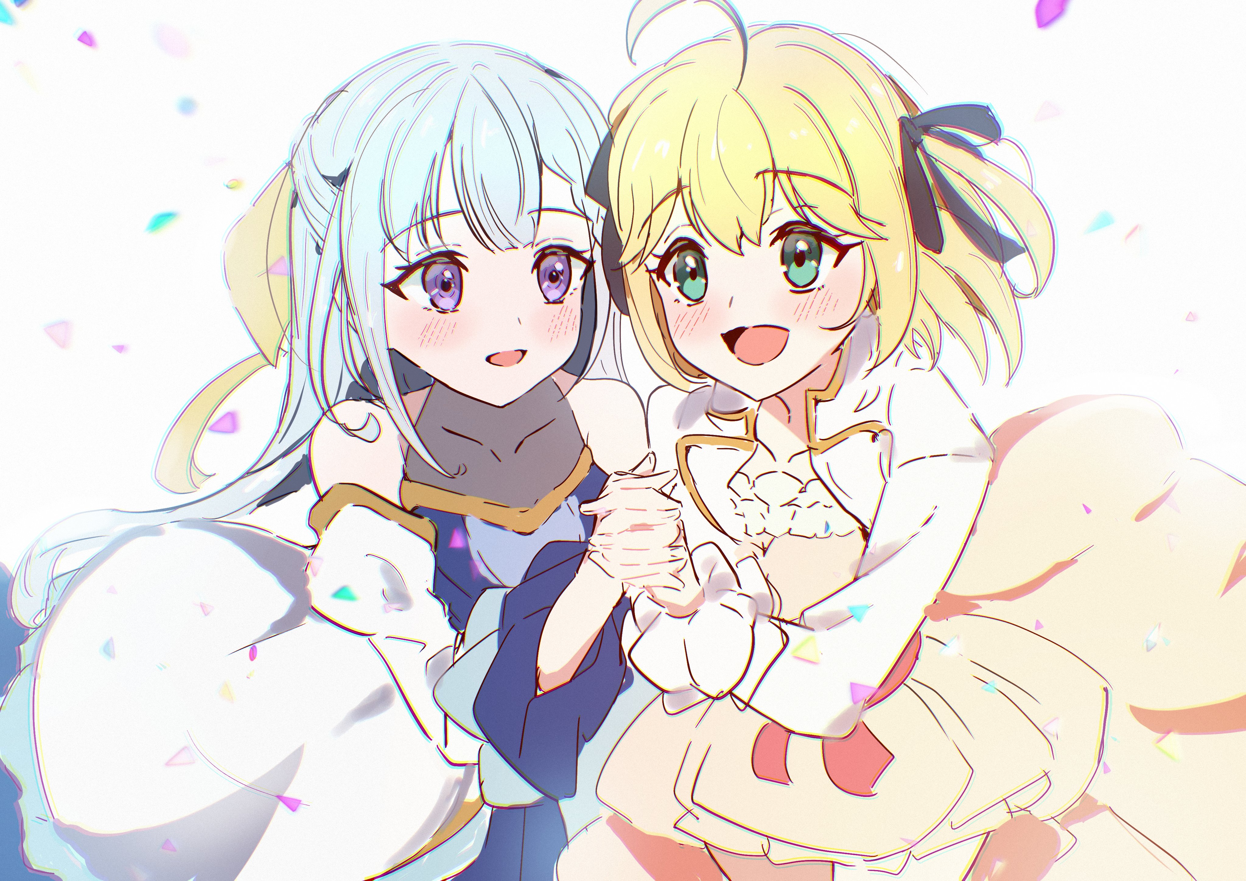 2girlsahogeaotama kimaaqua eyesblack ribbonblonde hairblue dressblue hairblushchromatic aberrationconfettidresshair ribbonholding handsinterlocked fingersjacketlong hairlooking at anothermedium hairmultiple girlsopen mouthpurple eyesribbonsimple backgroundsmilewhite backgroundwhite jacketyellow dressyellow ribbonyuri