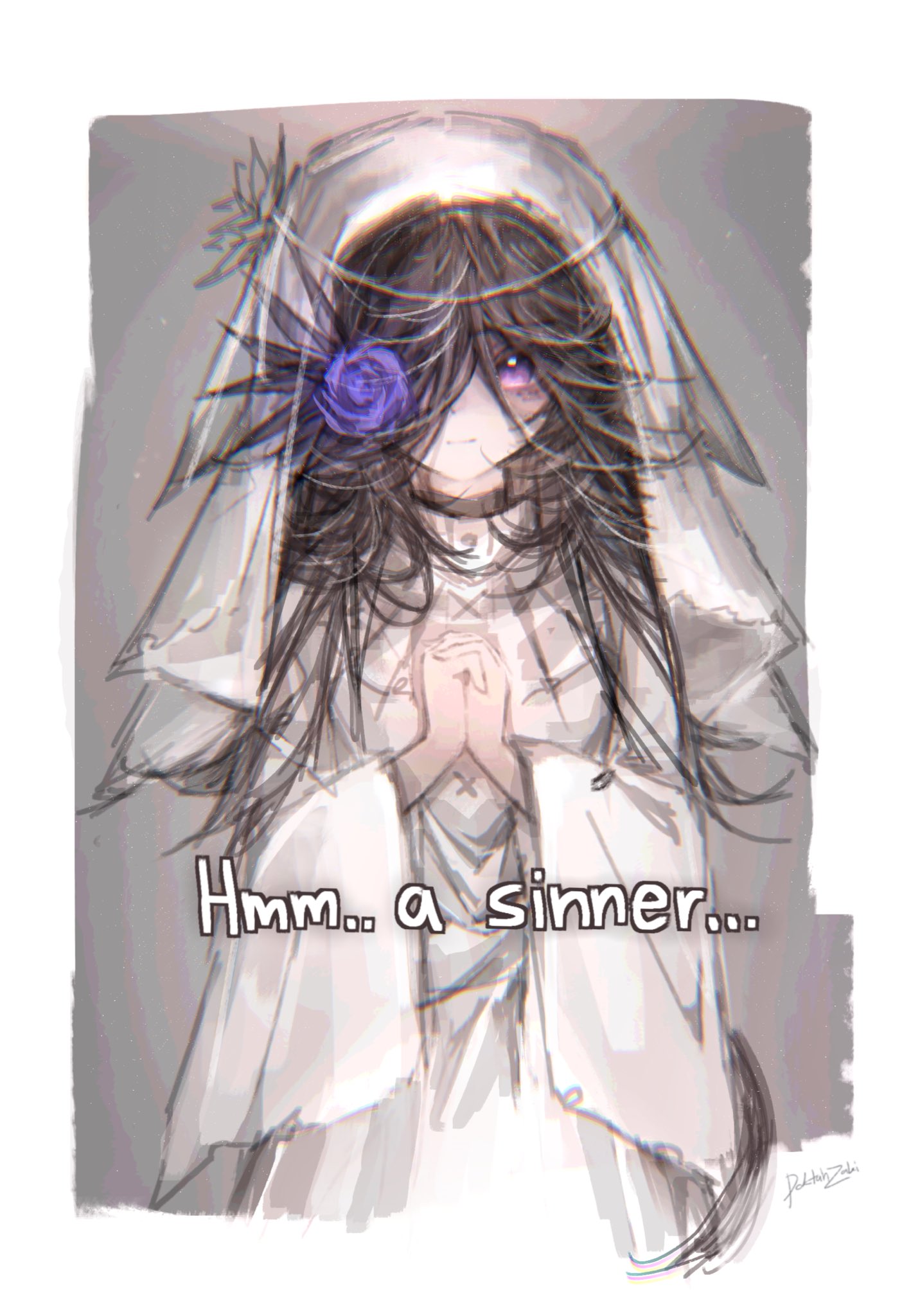 1girlanimal earsblue flowerblue roseblushbrown hairflipped hairflowerhair over one eyeholding handshorse earshorse girllong hairlong sleeveslooking at viewerprayingpurple eyesrose