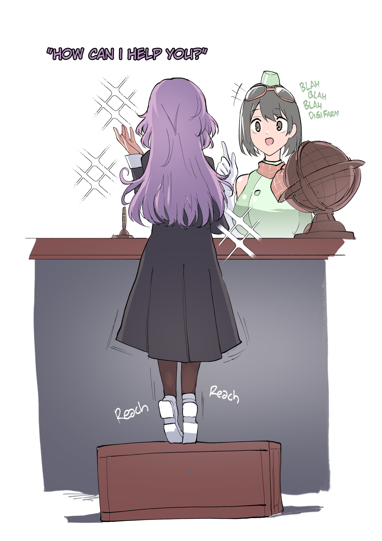 2girlsbare shouldersblack dressblack hairbreastsdressenglish textfrom behindfull bodylarge breastslong hairmultiple girlspurple hairshort hairsolo focus