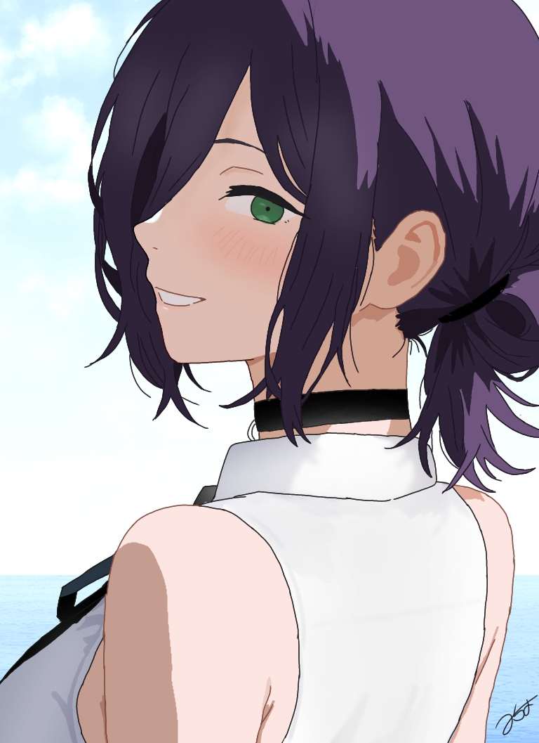 1girlblack chokerblack ribbonchokercollared shirtdaygreen eyesgrenade pingrinhair bunmi-blue-aneck ribbonoutdoorspurple hairribbonshirtsleevelesssleeveless shirtsmilesolowhite shirt