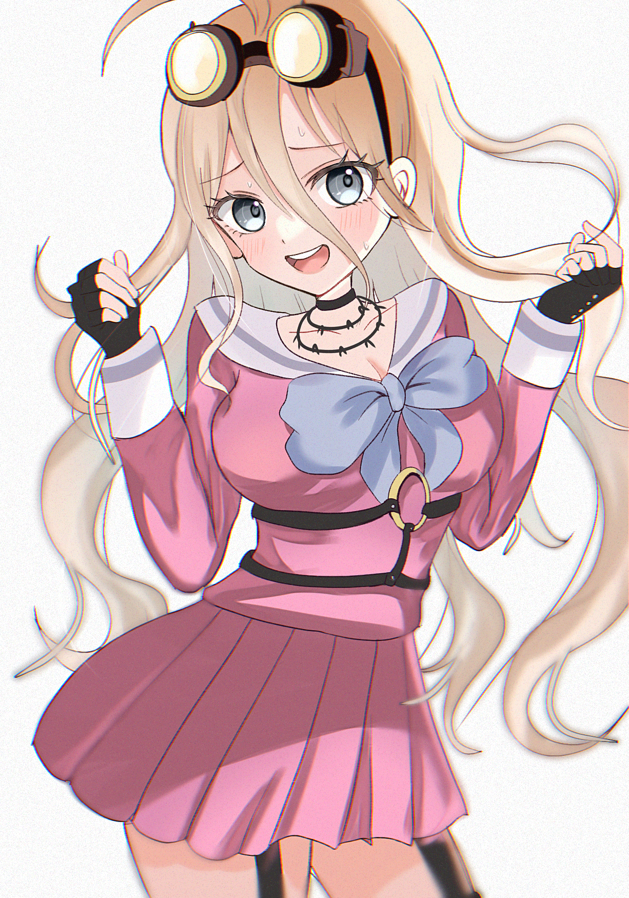 1girlbarbed wireblack chokerblack glovesblonde hairblue bowblushbowbreastschokercleavagecollared shirtcowboy shoteyelashesfingerless glovesglovesgogglesgoggles on headgrey eyeshair between eyeslong hairopen mouthpink serafukupink shirtpink skirtsailor collarschool uniformserafukushirtshort sleevessimple backgroundskirtsmilesolosweatteethupper teeth onlywhite backgroundwhite sailor collar
