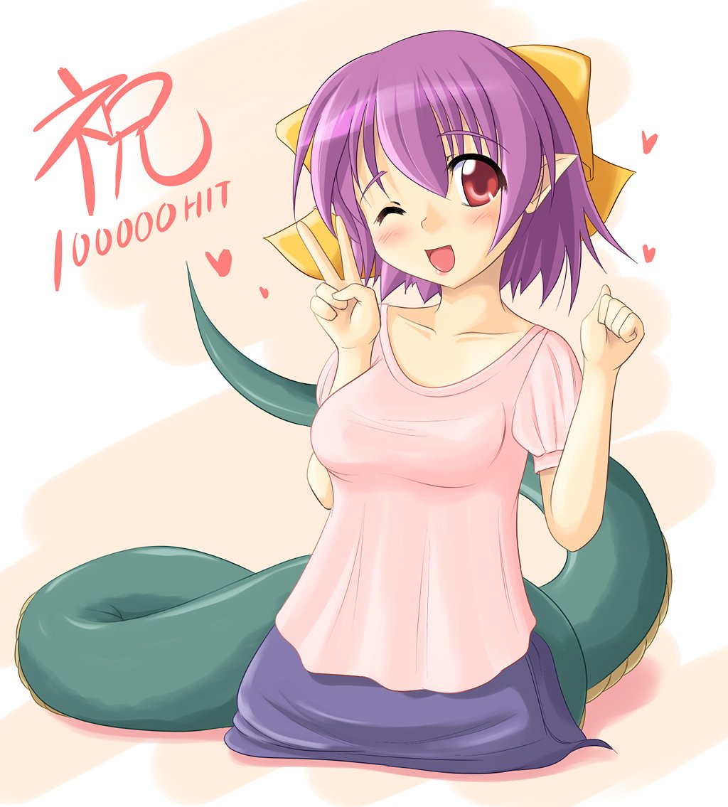:d1girlfemale focusheartlamiamilestone celebrationmonster girlone eye closedopen mouthpointy earspurple hairred eyesscalesshort hairsmilesolovwink
