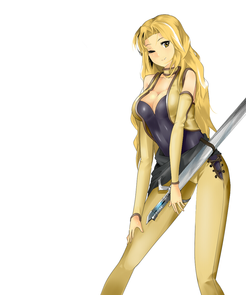 1990s (style)1girlblonde hairbreastscleavagecollardetached sleeveselbow glovesfemale focusgloveslarge breastslegslong hairone eye closedretro artstylesoloswordthighsvestweaponwinkyellow eyes