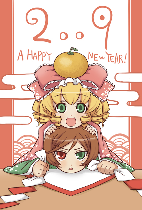 00s20092girlsblonde hairbowbrown hairdrill hairegasumifoodfood as clothesfruitgreen eyesheterochromiajapanese clotheskimonomandarin orangemultiple girlsnew yearopen mouthorange (fruit)seigaihashideshort hairsmilesweatdrop