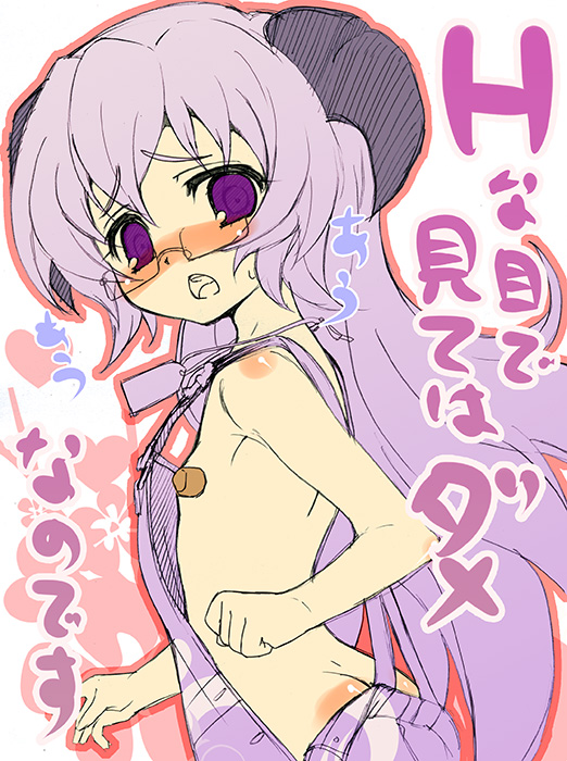 00s1girlbandaidbandaids on nipplesbespectacledblushbreastsbutt crackfemale focusflat chestflat colorglasseshornslong hairnaked overallsomamoriopen mouthoverallspastiespurple eyespurple hairsideboobsmall breastssolo