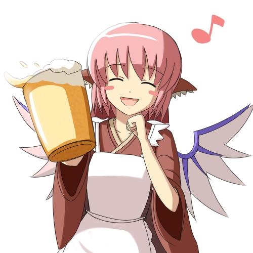 1girlalcoholanimal earsapronbeerclosed eyesfemale focusfrothjapanese clothespink hairshort hairsmilesolowings
