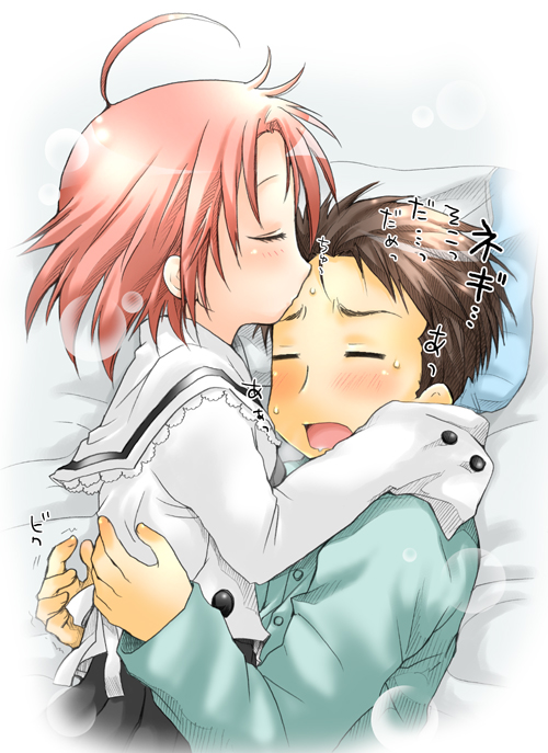 duskyhallows, carmen (sanguine rose), roman (sanguine rose), sanguine rose, 1boy, 1girl, black hair, blogspot username, breasts, brown hair, brown shirt, clothed male nude female, copyright name, english text, hands on own head, hetero, indoors, long hair, looking at another, medium breasts, nipples, nude, shirt, short hair, sitting, watermark, web address