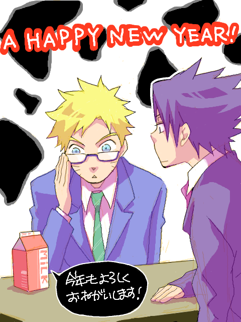 2boysadjusting eyewearalternate costumeblonde hairblouseblue eyescollared shirtcontemporaryenglish textfacial markglasseshalf-closed eyesmale focusmultiple boysnew yearshirtshort hairsittingspeech bubblespiked hairtriangle mouthwhisker markingswhite shirt