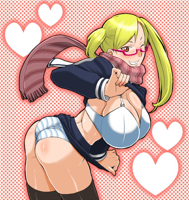 1girlassblonde hairbrabreastsbrown eyescleavageclothes liftfemale focusglassesgrinhearthuge breastsleaning forwardlingerieone eye closedpantiesscarfshirt liftskirtskirt liftsmilesolostriped clothesstriped pantiesstriped scarfteasingthighhighstwintailsunderwearuneven twintailswink