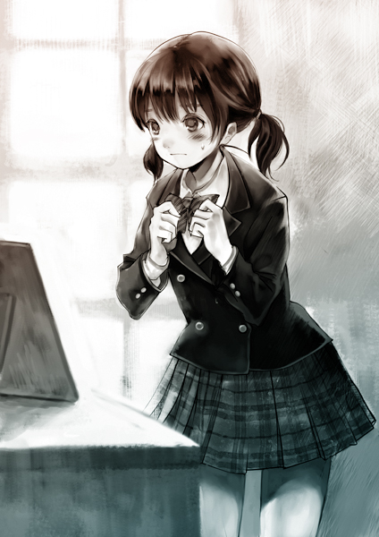 1girlblue themebrown themefemale focusmonochromeplaid clothesplaid skirtschool uniformshort hairshort twintailsskirtsolotwintails