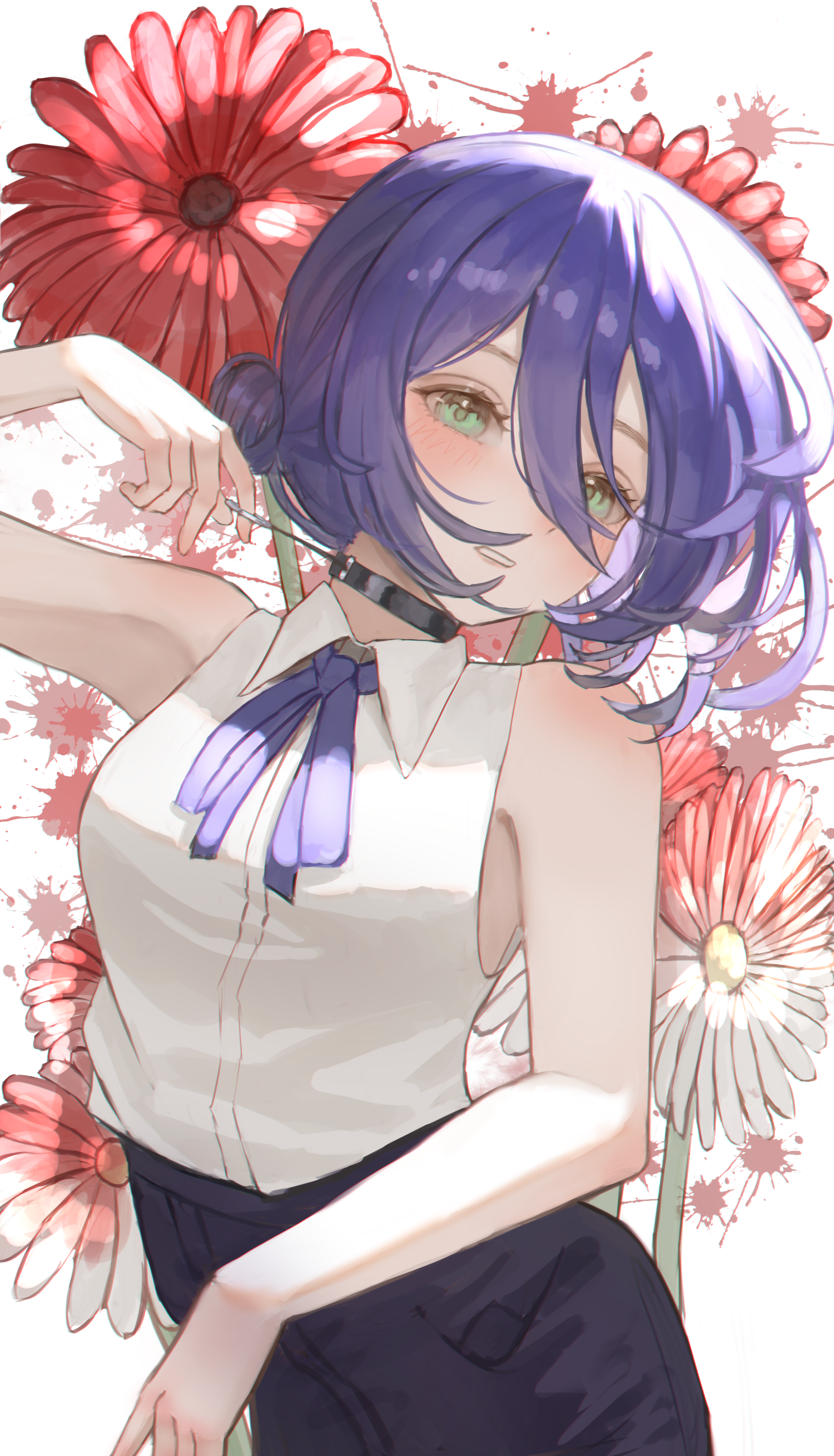 ann (enye5842), lauma (genshin impact), genshin impact, absurdres, highres, 1girl, 1other, antlers, aqua eyes, breasts, cleavage, closed mouth, deer, dress, flower, green dress, hair over one eye, hand on another's head, horns, large breasts, long hair, looking at another, pointy ears, purple hair, reindeer antlers, reindeer girl, sleeveless, sleeveless dress, very long hair, white flower