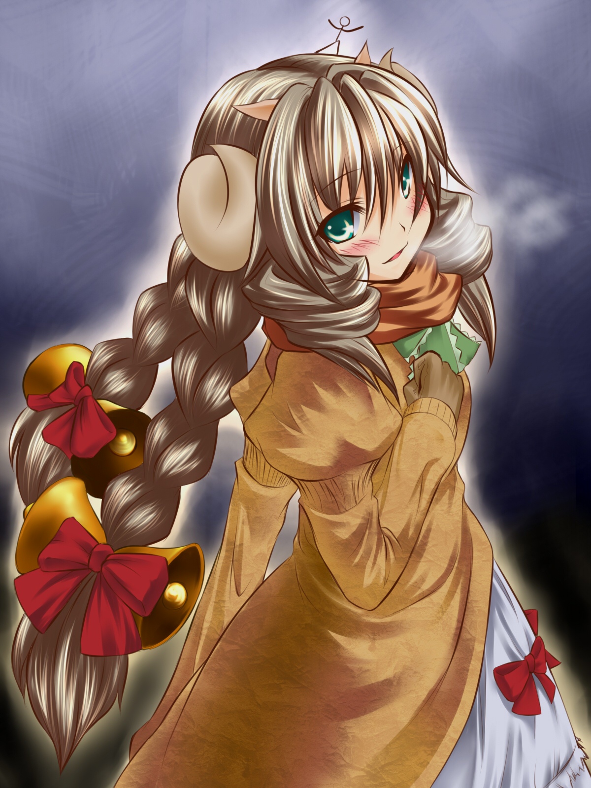 10sanimal earsbellblushbowbraidbrown hairdressglovesgreen eyeshair bowhornsscarfsheep earssolotwin braids