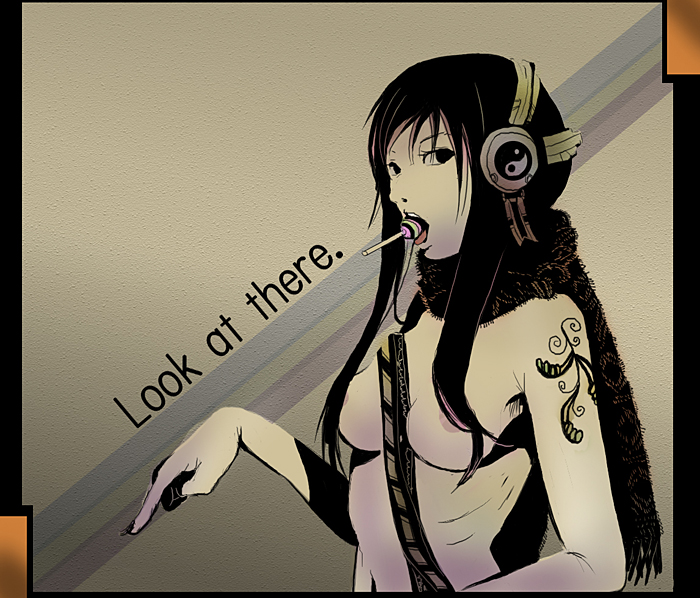 1girlbreastscandyenglish textengrish textfemale focusfoodheadphoneslollipopmedium breastsmouth holdpointingranguagesolotattootopless female