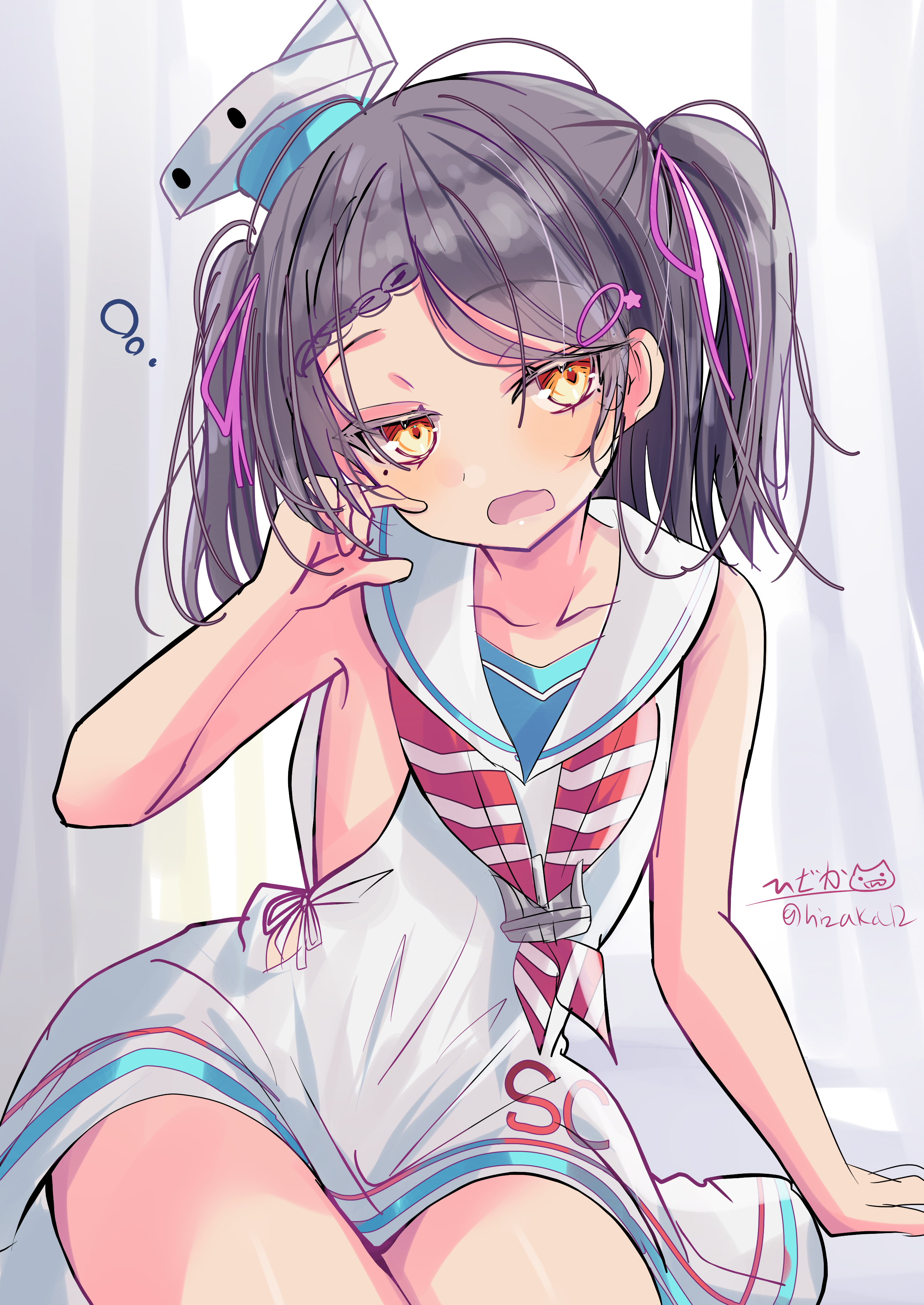 1girlbare shouldersblack hairblushbraiddresshair ornamenthair ribbonhaircliphatlong hairlooking at viewermolemole under eyeneckerchiefopen mouthorange eyesribbonsingle braidsittingsleepysleevelesssleeveless dresssolotwintailstwitter usernamewhite dress