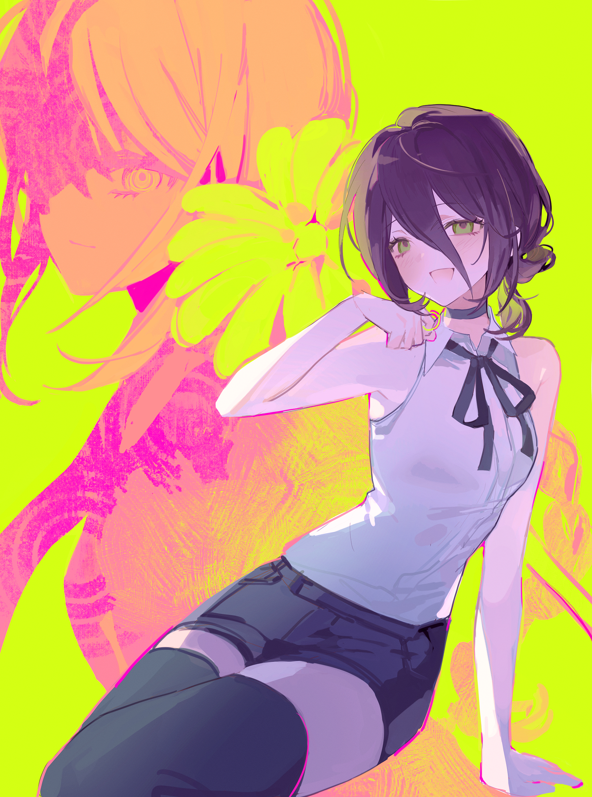 kuuron (moesann17), puzzle & dragons, absurdres, highres, 1girl, blue eyes, breasts, broken, broken arm, broken leg, broken vase, claudia (puzzle & dragons), eyes visible through hair, from below, hair between eyes, hair ornament, long hair, looking down, mechanical arms, mechanical legs, science fiction, solo, white hair