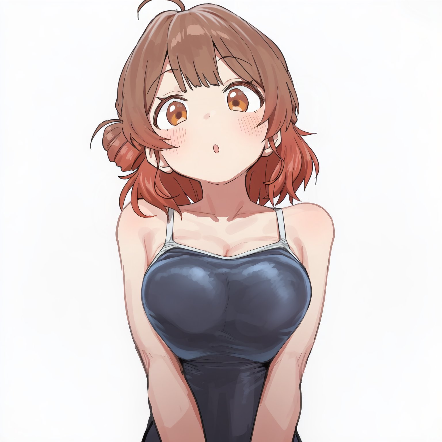 1girlahogeblue one-piece swimsuitblushbreastsbreasts squeezed togetherbrown eyesbrown haircleavagehair bunlarge breastsone-piece swimsuitopen mouthshort hairside bunsingle hair bunsoloswimsuitwhite background