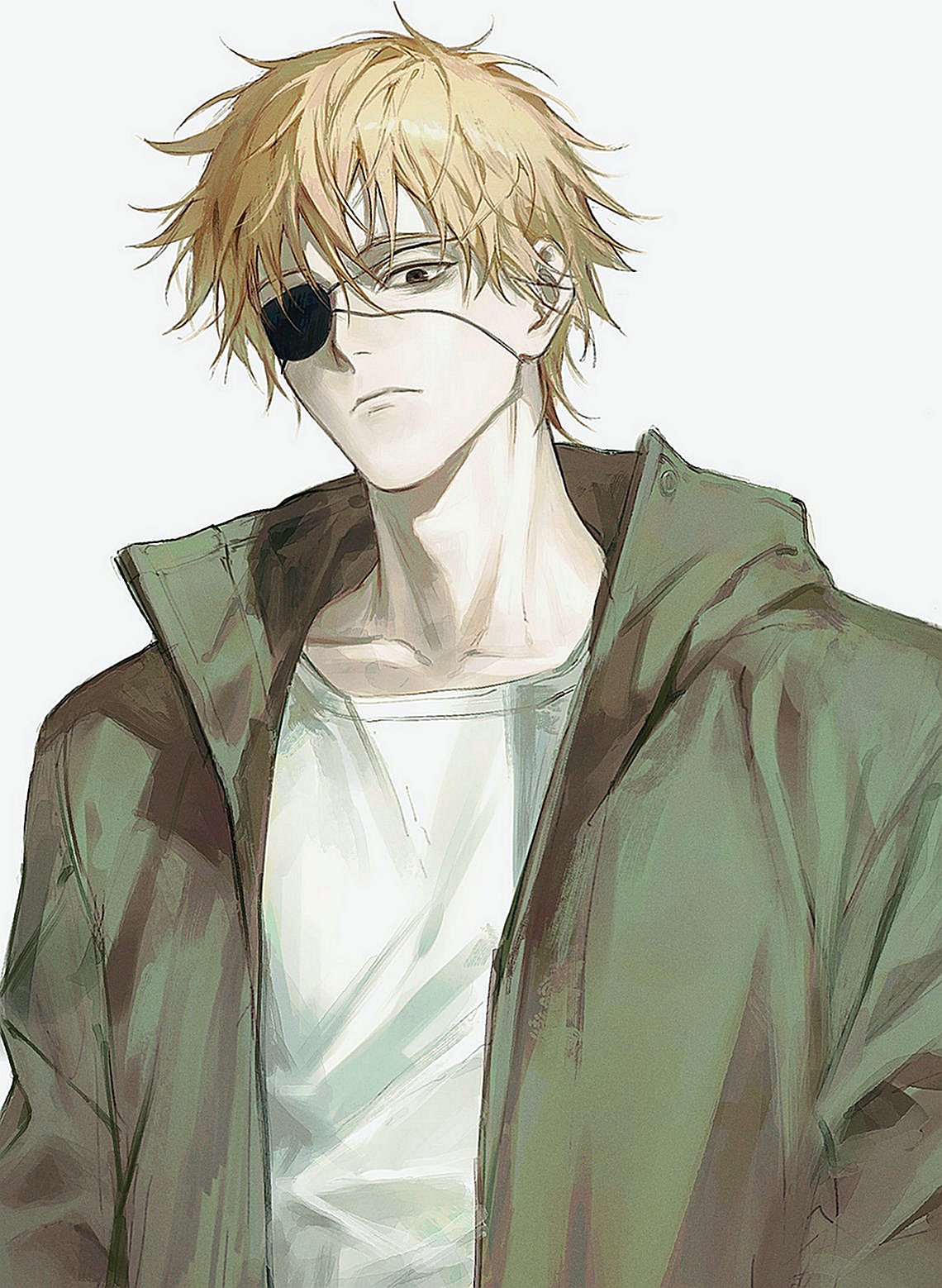 1boybags under eyesblonde hairclosed mouthcoatcollarbonecrew neckeyepatchfrowngreen coatmale focusone eye coveredopen clothesopen coatshirtsimple backgroundsoloupper bodywhite backgroundwhite shirt
