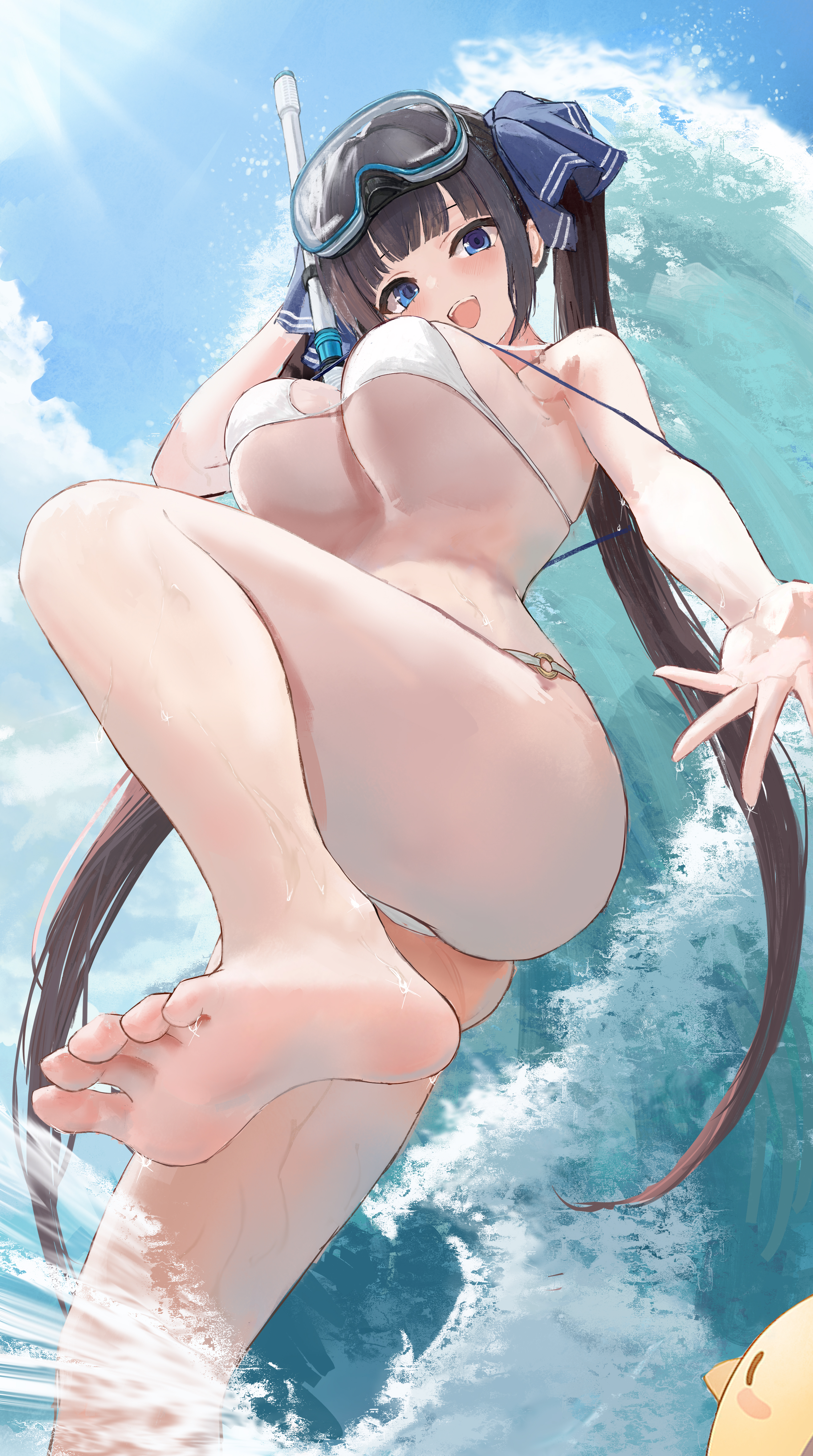 1girlarm upassbarefootbikiniblack hairblue eyesblue skybreastsclouddiving maskdiving mask on headgogglesgoggles on headlarge breastsleg uplong hairlooking at viewerlooking downmasko-ring bikini bottomopen mouthoutdoorssideboobskysmilesnorkelsolessolo focusswimsuitteeththighstwintailsunderboobupper teeth onlyvery long hairwaterwaveswetwhite bikini