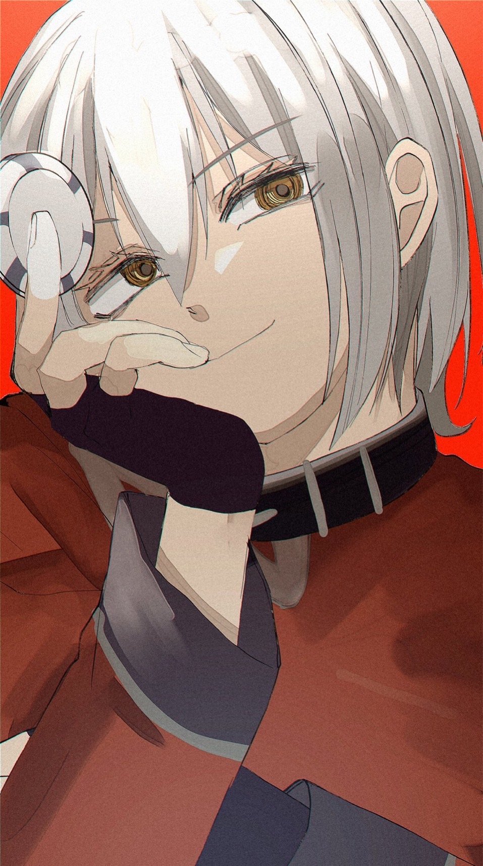 1boy408 zzzblack glovesbrown eyesdino medalfingerless glovesglovesholdingjacketlooking at viewerred backgroundred jacketrupert (fossil fighters)simple backgroundsolowhite hair