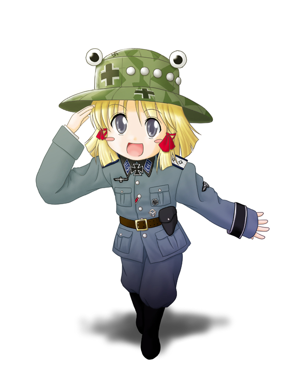 1girlblonde hairbootscamouflagecrossfemale focusflying saucerhair ribbonhatholsteriron crossmedalmilitarymilitary uniformnaziribbonsalutesolospacecraftswastikaufo
