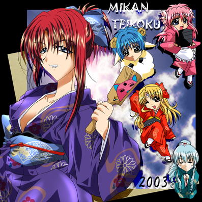 map (blue catty), aizawa tomomi, pia carrot (series), pia carrot e youkoso!!, highres, 1990s (style), 3girls, brown hair, long hair, multiple girls, multiple persona, purple eyes, thighhighs, twintails, very long hair, waitress