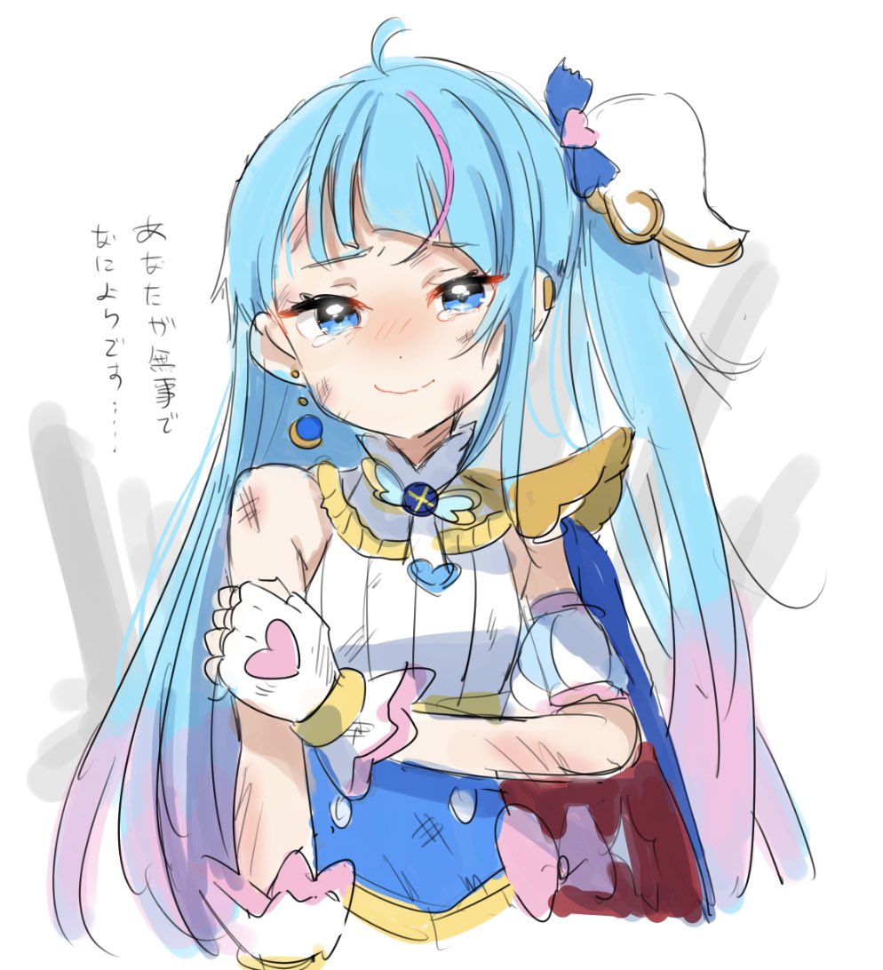 1girlalternate hairstyleblue capeblue dressblue eyesblue hairbowbroochcapeclosed mouthcut bangsdetached sleevesdirtydirty clothesdirty facedressdress bowearringsfingerless glovesglovesgradient hairhair downhair ornamenthand on own armjewelrylong hairlooking at viewermagical girlmulticolored hairone side uppink bowpink hairpuffy detached sleevespuffy sleevesred capesingle sidelocksketchsleevelesssleeveless dresssmilesolostreaked hairtearing uptwo-sided capetwo-sided fabrictwo-tone dresstwo-tone hairupper bodyvery long hairwhite dresswhite gloveswing broochwing hair ornament