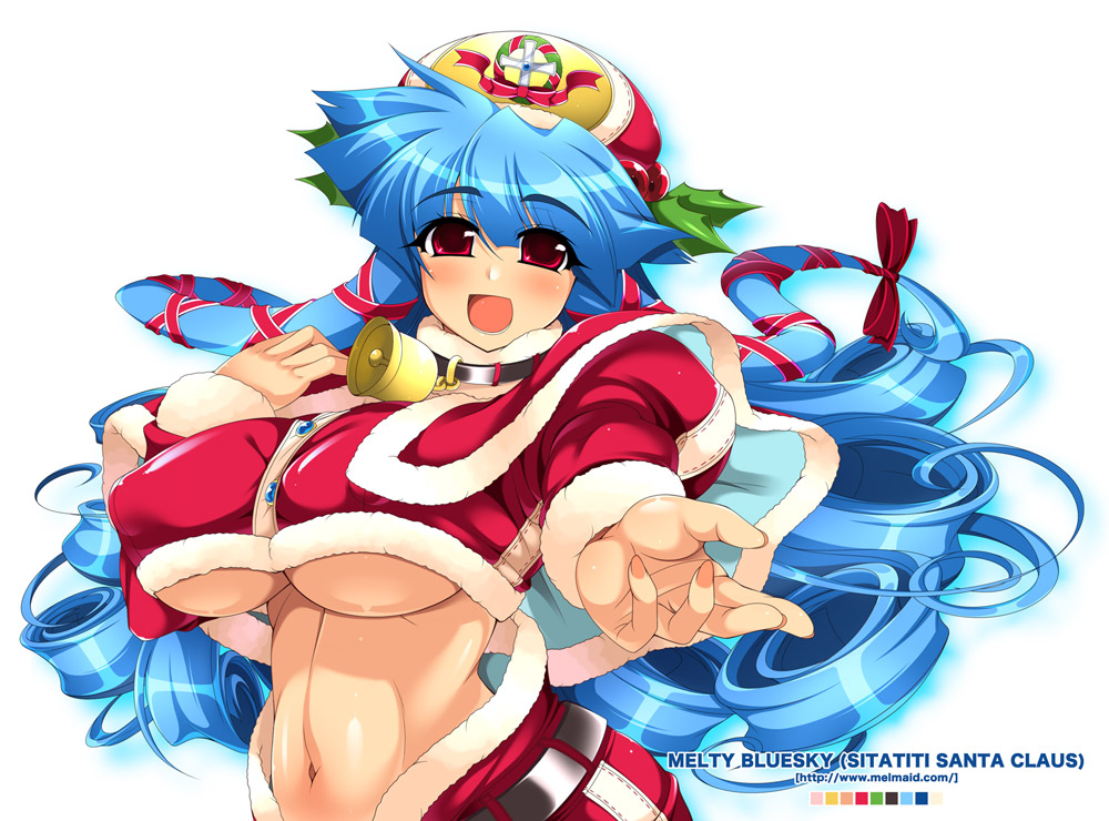 1girlbellblue hairblushbreastschristmascovered erect nipplesfemale focusfur trimhair ribbonhathuge breastslong hairmidriffnaveloutstretched handred eyesribbonsanta costumesidelockssolounderboob