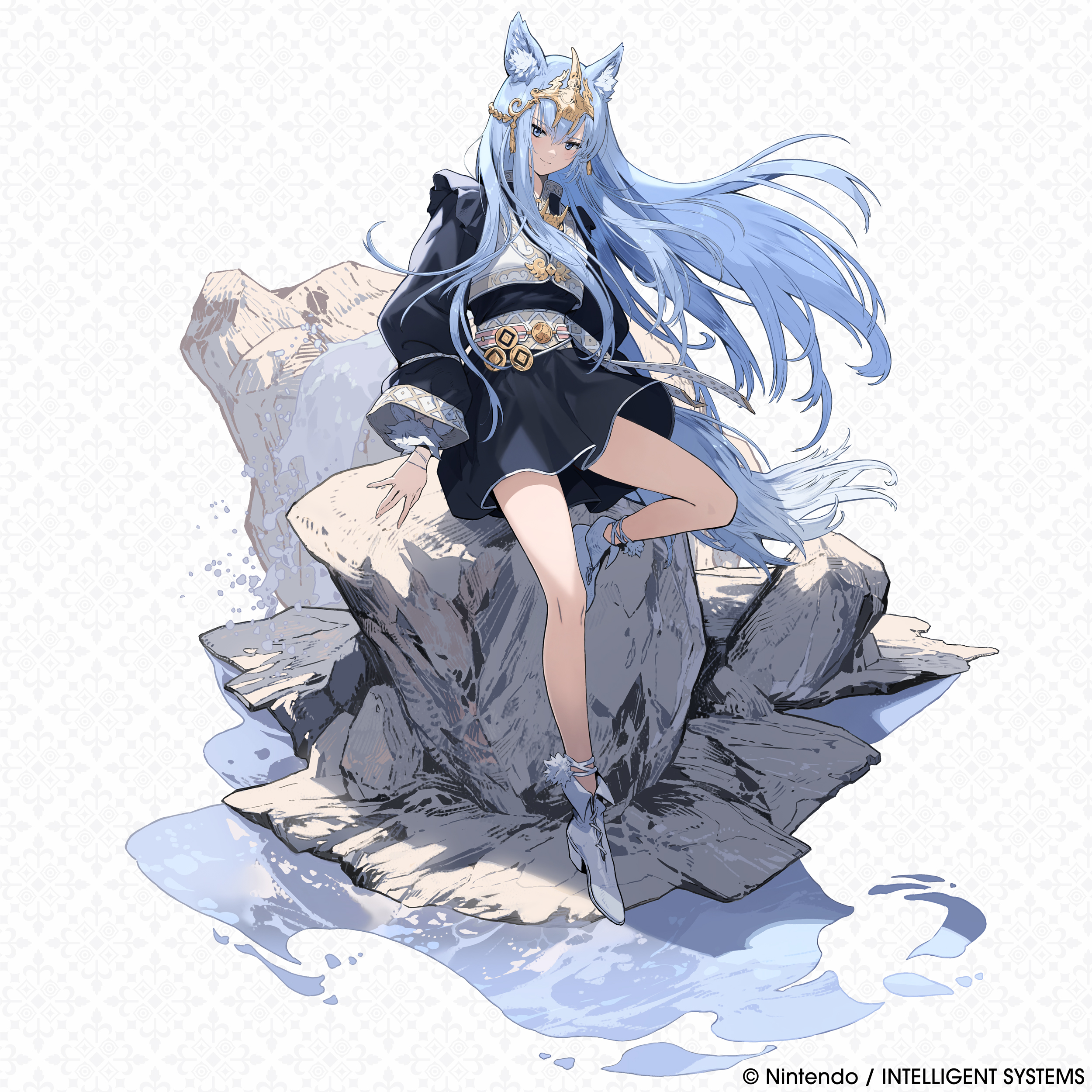 yakumo crack, la pluma (arknights), arknights, 1girl, ahoge, black eyes, black hair, black sleeves, blue background, detached sleeves, feather hair, fingernails, from above, hair intakes, hairband, hands up, jewelry, long sleeves, looking at viewer, parted lips, portrait, rhodes island logo (arknights), ring, shirt, short hair, simple background, solo, white shirt