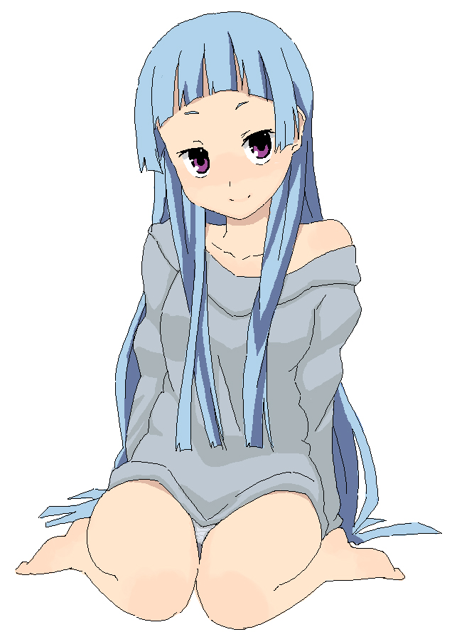00s1girlbarefootblue hairblunt bangsfemale focusfull bodykneelinglong hairlooking at vieweroekakioff shoulderpurple eyessimple backgroundsittingsmilesolosweaterwarizawhite background
