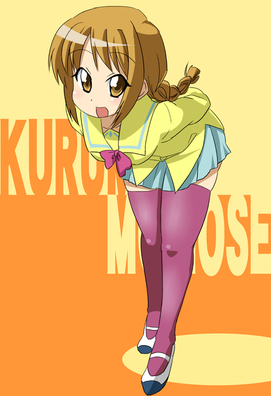00s1girlbent overblouseblushbraidbrown eyesbrown haircharacter namecollarbonecurvydot nosefemale focusfull bodylong sleeveslooking at vieweropen mouthpink thighhighspurple thighhighsschool uniformshirtshoesskirtsolostandingthighhighsuwabakiyellow shirtzettai ryouiki