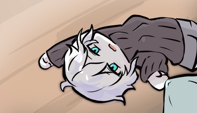 1girlarm upblack sweaterblue eyesbreastschibigrey hairgrey shortshair between eyeslong sleeveslooking at viewerlyingmedium breastson backparted lipsribbed sweatershortssolosweaterturtleneckturtleneck sweater