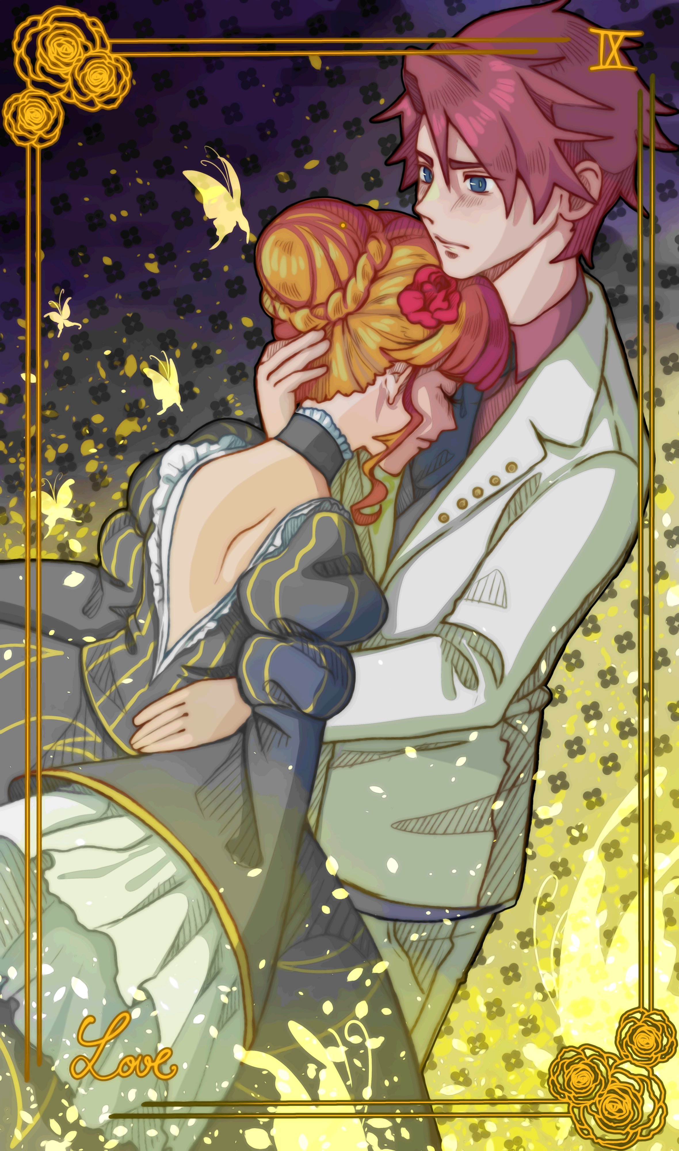1boy1girlblack dressblonde hairblue eyesbugbutterflychokerclosed eyesdressenglish textflowerformal clothesfrillsgold trimhair flowerhair ornamenthuginsectnecktiered hairroseshort hairsuitwhite suit