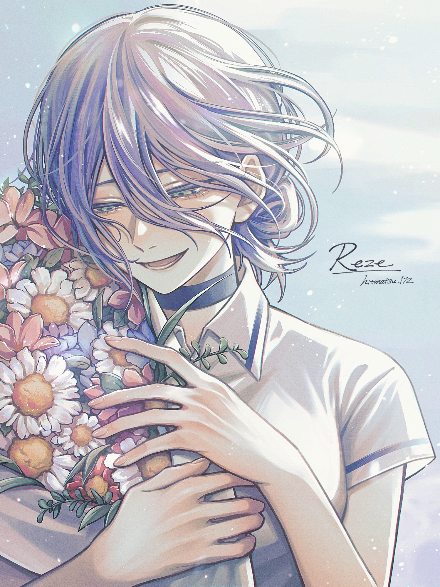1girlartist nameblack chokerbouquetcharacter namechokerflowergreen eyeshair between eyeshitonatsu 172holdingholding bouquetlower teeth onlyopen mouthpink flowerpolo shirtpurple hairshirtsoloteethwhite flowerwhite shirt