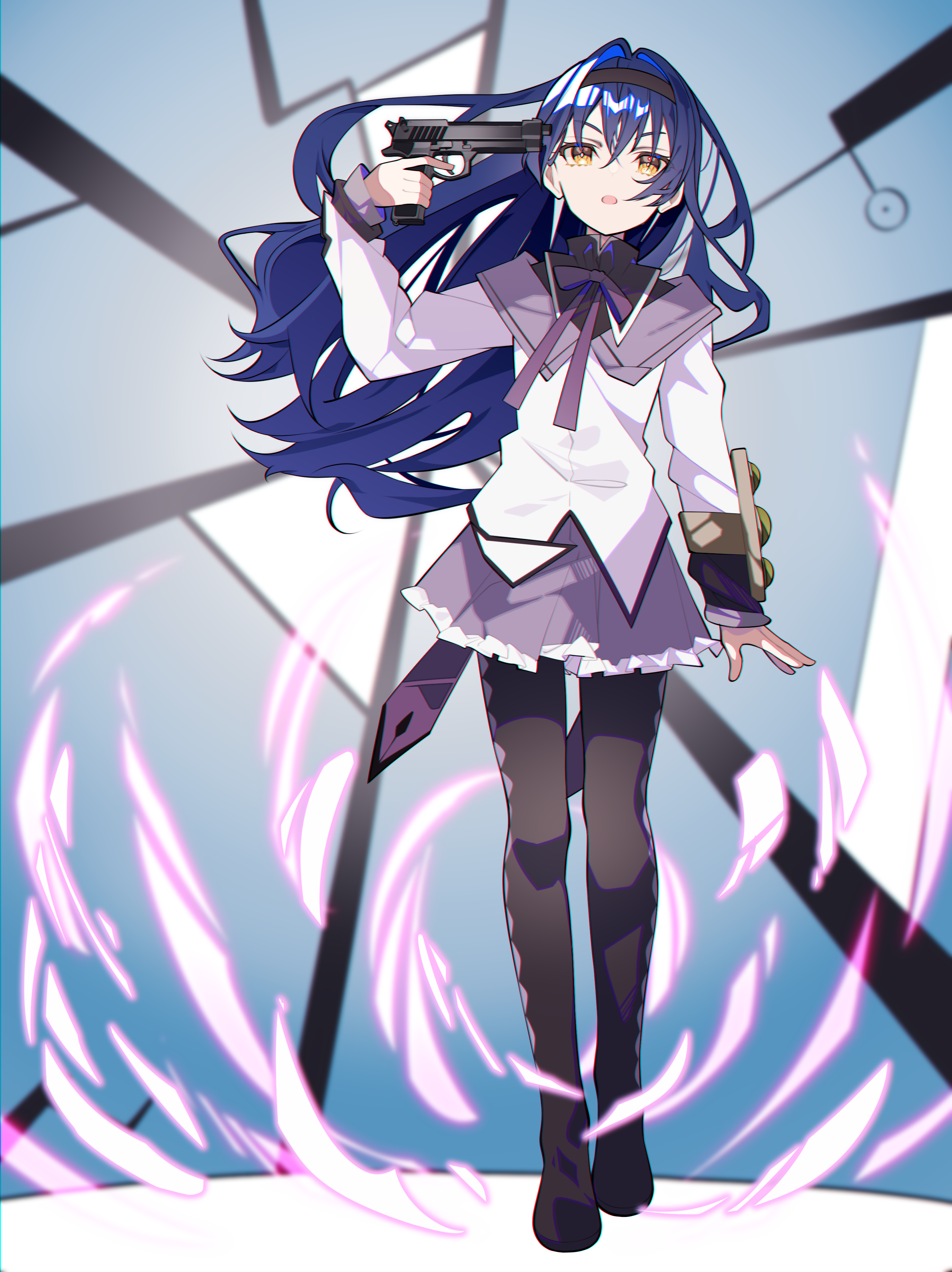 1girlakemi homura (cosplay)beretta 92black pantyhoseblack shirtblue haircosplayfrilled skirtfrillsfull bodygrey skirtgungun to headhandgunholdingholding gunholding weaponlong sleeveslooking at viewerminiskirtopen mouthpantyhosepleated skirtshirtskirtsolov-shaped eyebrowsweaponyellow eyes