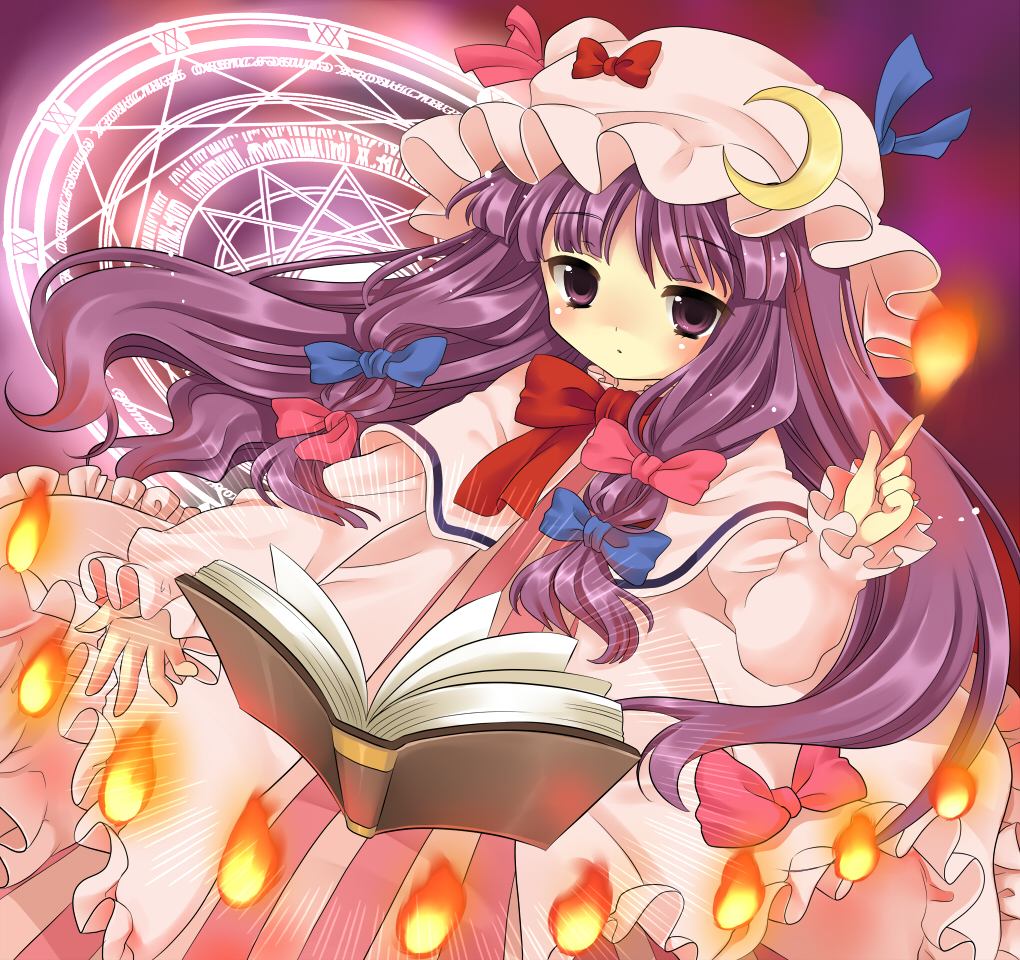 1girlbookbowcrescent hat ornamentdodecagramfemale focusfirehair bowhathat ornamentmagic circlemultiple hair bowsopen bookpink bowpointingpurple backgroundpurple eyespurple hairsolo