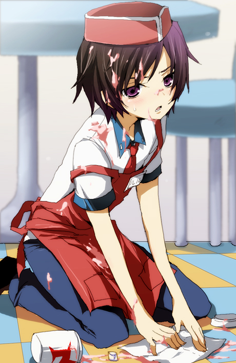 tsuruya, suzumiya haruhi no yuuutsu, 00s, 1girl, :3, breasts, brown eyes, fang, female focus, green hair, medium breasts, nipples, solo, topless female