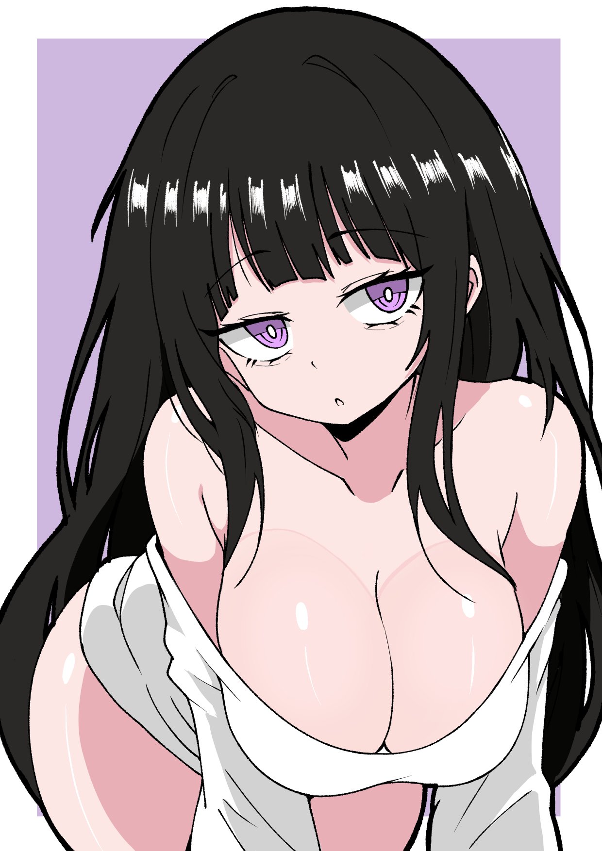 :o1girlbare shouldersbent overblack hairborderbreastscleavagelarge breastslong hairlooking at viewerpurple backgroundpurple eyesshirtsolothighswhite borderwhite shirt